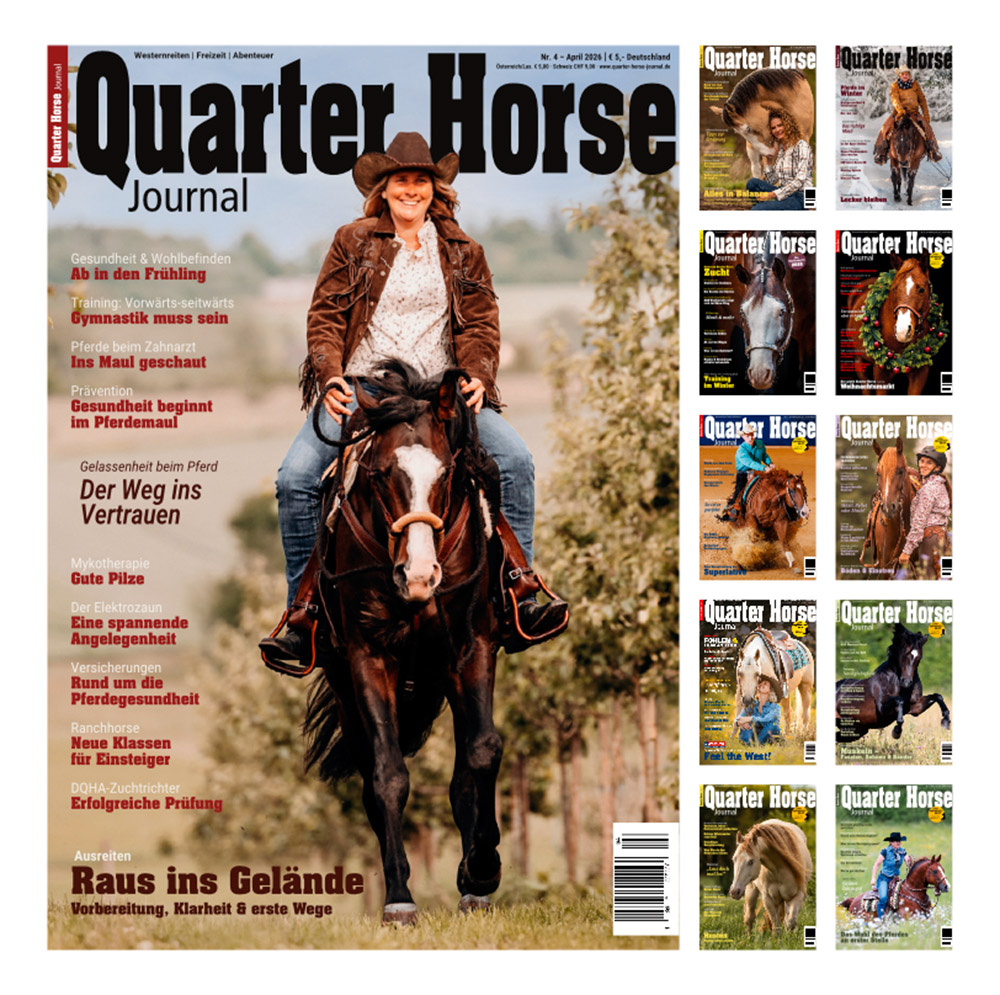 Das Quarter Horse Journal erscheint monatlich und bietet seinen Lesern eine große Vielfalt an Themen rund ums Westernreiten. Entdecke die Welt des American Quarter Horse, erfahre Neuigkeiten rund um Sport und Show, probier die Trainingstipps mit deinem Westernpferd aus, lass dich auf spannende Western-Touren durch den „Wilden Westen“ entführen oder stöbere durch unsere große Vielfalt an Beiträgen zu den Themen Futter, Haltung und vielem mehr.